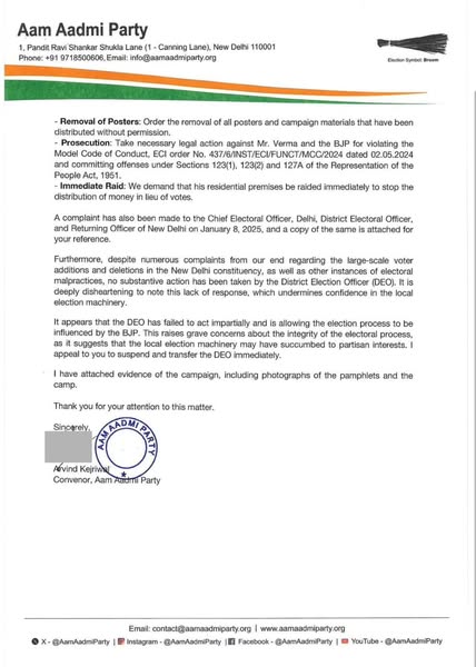 AAP National Convenor @ArvindKejriwal meets the chief election commissioner and submits a letter demanding action against the illegal practices of Parvesh Verma & local DEO should be immediately suspended.
