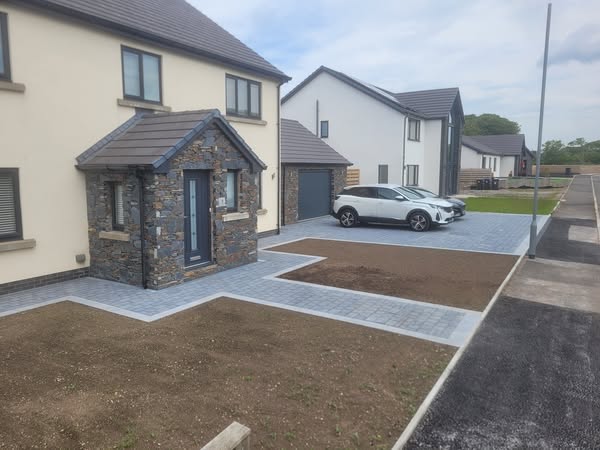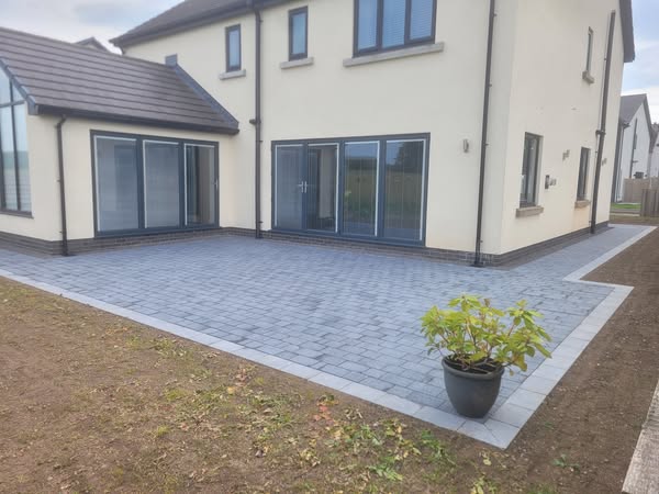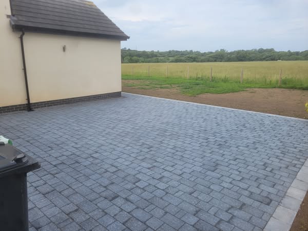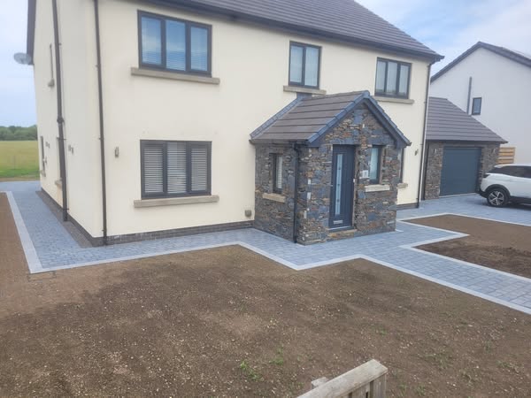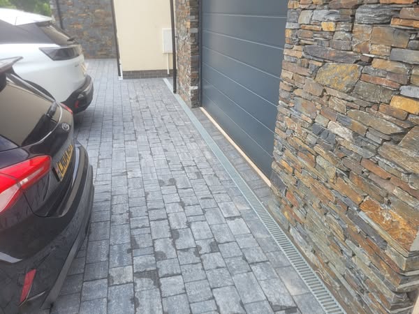 Recently completed Marshalls Lunar block paving with a Silver Dust border and Shadow project packs for the main areas along with all the nessecery drainage for the lawn and paved areas.