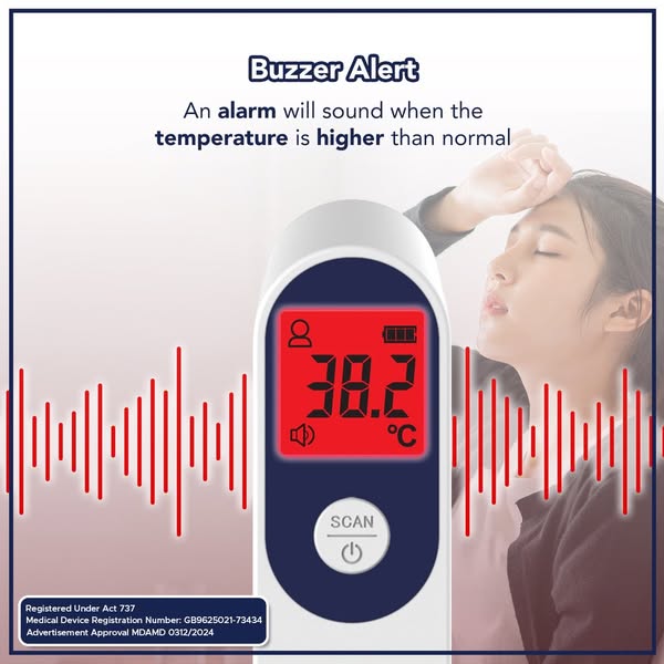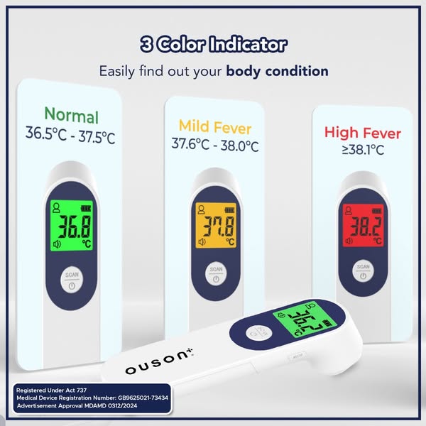搜索关键词 infrared thermometer, non contact thermometer, fever check, Ouson Thermometer, medical thermometer, digital thermometer, family health, temperature monitoring, Malaysia thermometer, rapid temperature reading优势 Instant non-contact temperature readings,Hygienic and easy to use,3-Color Backlight for easy fever detection,Multi-purpose temperature measurement,Fever warning at 38°C,20 Memory Records,Medical-grade accuracy,2 Years Local Warranty,1-to-1 Exchange Guarantee