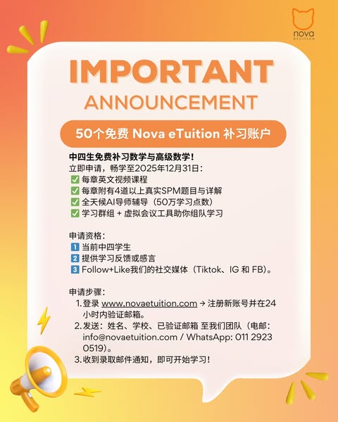 🚨 50 FREE Nova eTuition Accounts to Study Form 4 Math & Add Math! 🚨