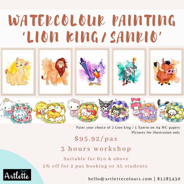 Note: For 2 pax booking, please email to hello@artlettecolours.com with the student name, DOB and contact number to enjoy the 5% off! Prices are inclusive of GST.