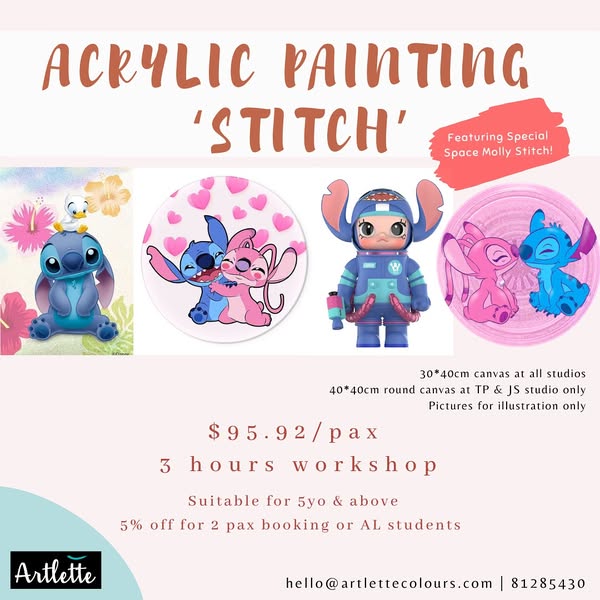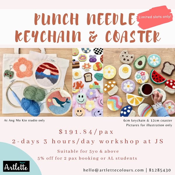 搜索关键词 art holiday workshops, kids art classes, singapore art workshop, watercolour painting class, acrylic pour workshop, punch needle workshop, art and craft classes, art for kids, children art program, school holiday activities优势 Fun and learning combined,Memorable and educational break,Variety of art forms,5% discount for two pax