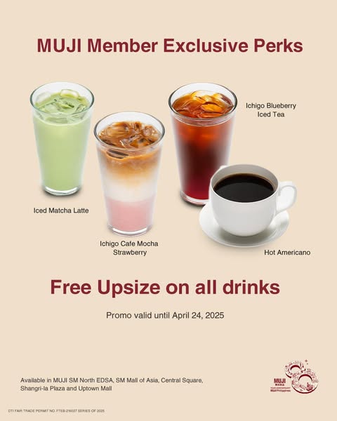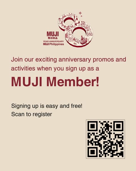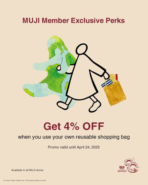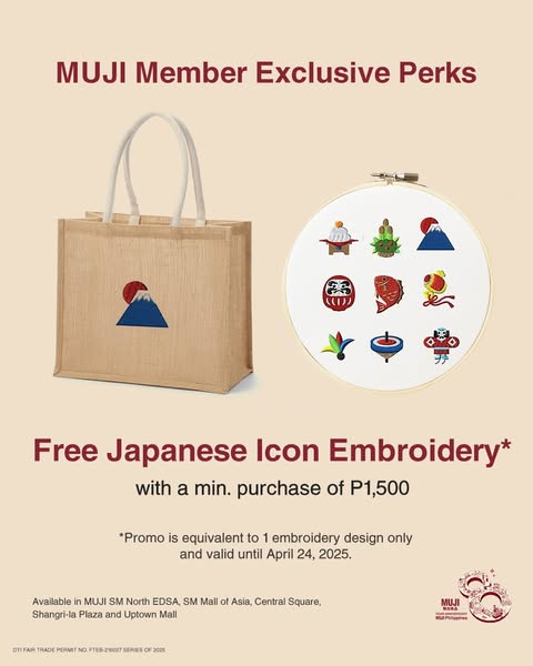 In celebration, we’ll be treating all MUJI members to 4% discount when they use your own reusable shopping bag, 1 free Japanese icon embroidery with a minimum purchase of only P1,500, and a free upsize on all drinks.