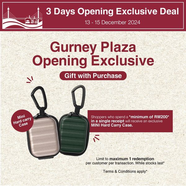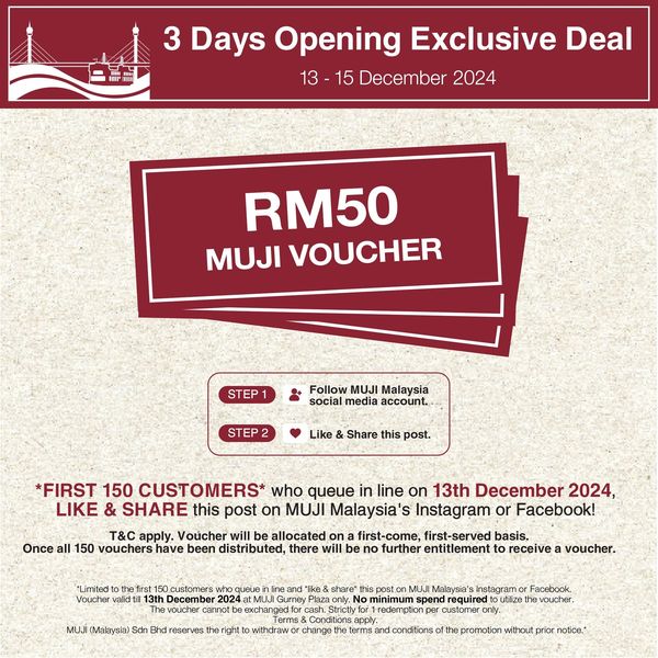 搜索关键词 MUJI Gurney Plaza, Penang Opening, Free Voucher, Opening Specials, Mini Hard Case, Retail Promotion, Limited Time Offer, Department Store Opening, Malaysia Retail, Exclusive Gift优势 Free RM50 Voucher for First 150 Customers,Exclusive Mini Hard Carry Case with RM200 Spend,Limited Time Opening Specials